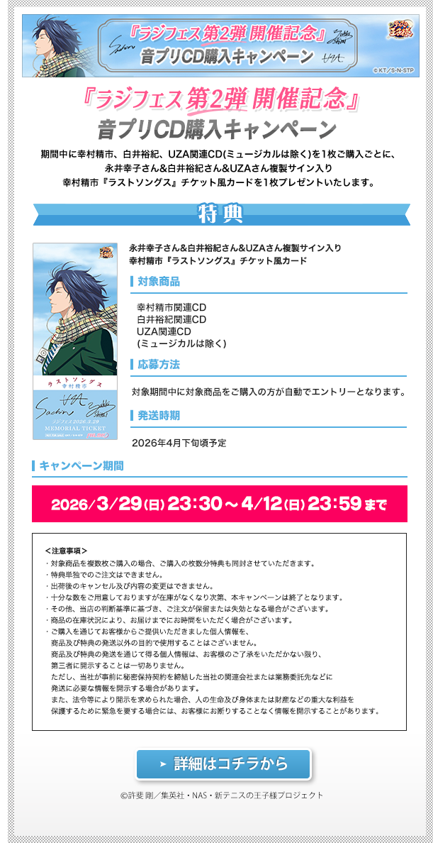 - 25/09/25 不二周助,宍戸 亮, 柳生比呂士, 木手永四郎,千歳千里, 毛利寿三郎「歌をうたおう」販売開始