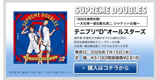 - 26/04/23 「SUPREME DOUBLES〔初回生産限定盤〕~大石秀一郎&菊丸英二 ジャケット仕様~」テニプリ“D”オールスターズ 販売開始